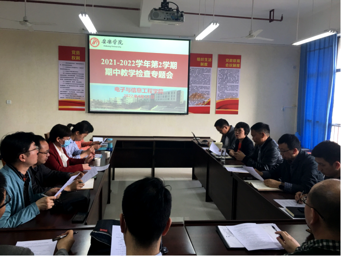 为进一步规范电信学院教学运行管理工作,切实保障教学工作秩序,总结本学期授课工作经验,做到查漏补缺,及时发现和解决教学中存在的问题,确保教学质量。根根据教务处《关于开展2021-2022学年第二学期期中教学自查的通知》要求,学院4月13日下午在科技楼B702召开本学期期中教学自查工作专题会,学院领导班子、系(教研室)主任、两办主任、学院教学督导、教学秘书参加会议,会议由学院副院长宋权华主持。