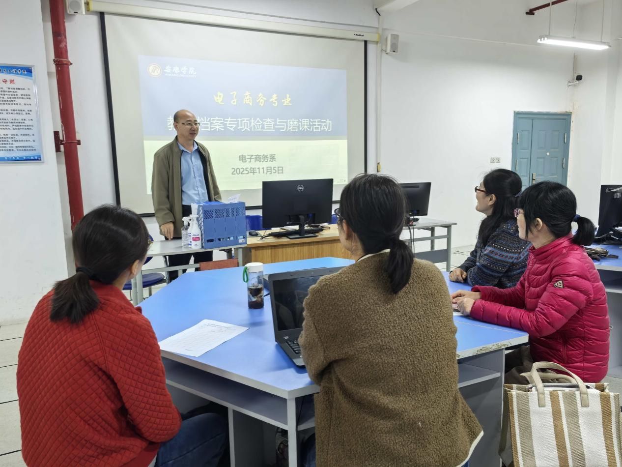 为迎接学校本科教学审核评估“回头看”工作,切实提升教育教学质量与人才培养水平,深化课堂教学改,促进教学方式转变,提升教师专业化水平,整体推动教育教学质量的提升,电子商务系于2025年11月5日下午在逸夫科技楼B402开展了“说课、磨课”活动。活动由赵志强主持,电子商务系全体教师参加,邀请了院级教学督导杨小艳进行现场点评指导。此次活动严格按照学校及学院《关于组织开展教学档案专项检查与磨课活动的通知》要求执行,得到了全体专任教师的高度重视和积极参与。