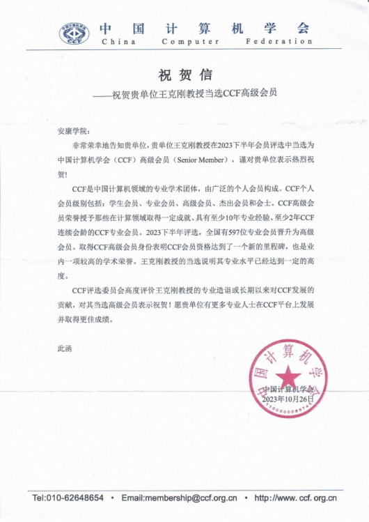 近日,中国计算机学会(CCF)向我校发来贺信,祝贺我校pa电子官方网站王克刚教授当选CCF高级会员,同时欢迎我校有更多计算机专业人士在CCF平台上发展,并取得优异的成绩。
