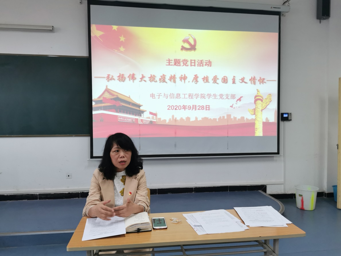其次,党总支书记于咏梅传达了习近平总书记在全国抗击新冠肺炎疫情表彰大会上的讲话精神,并结合pa电子官方网站学生实际,对广大学生如何弘扬伟大抗疫精神,厚植爱国主义情怀提出了具体要求:①生命至上,敬畏生命、敬畏自然、敬畏规则;②举国同心,爱国是本能,爱国是本分,是职责;③舍生忘死,爱国和爱家、爱校是一致的,有全局意识;④尊重科学,坚守学生的本分,做到回归常识;⑤命运与共,高举爱国主义旗帜,将爱国进行到底。