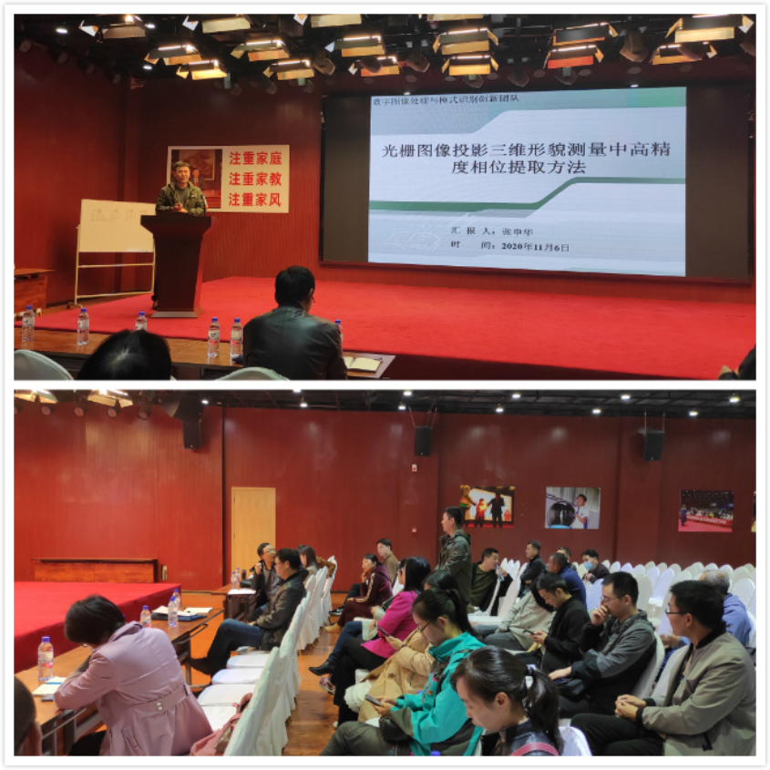 张申华博士做了题为 “光栅图像投影三维形貌测量中高精度相位提取方法”的学术报告,介绍了光栅图像投影三维形貌测量中高精度相位提取的关键技术。全体老师认真的聆听了报告,并与张申华博士进行了深度的交流讨论。