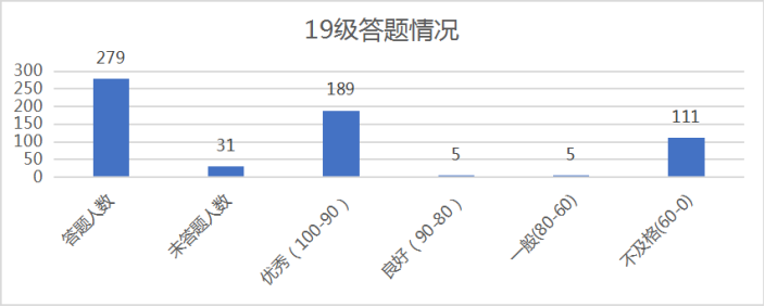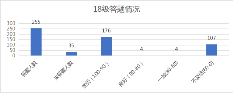 本次比赛共有766名同学参与,参与率达到85%以上,优秀率达到62%以上,其中2019级参与人数最多、参与率最高;2020级优秀人数最多、优秀率最高。在众多班级中又以2018级物联网工程1班成绩最佳,摘得大赛魁首。
