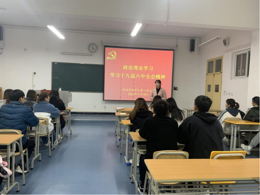 2021年11月18日下午,pa电子官方网站学生第二党支部在江北校区1321教室开展主题党日活动,就《习近平总书记在庆祝中国共产党成立一百周年大会上的讲话》和《中国共产党第十九届中央委员会第六次全体会议公报》进行专题学习,学生第二党支部支委、全体在校党员及发展对象参加了此次会议,会议由学生第二党支部书记李章雨主持。