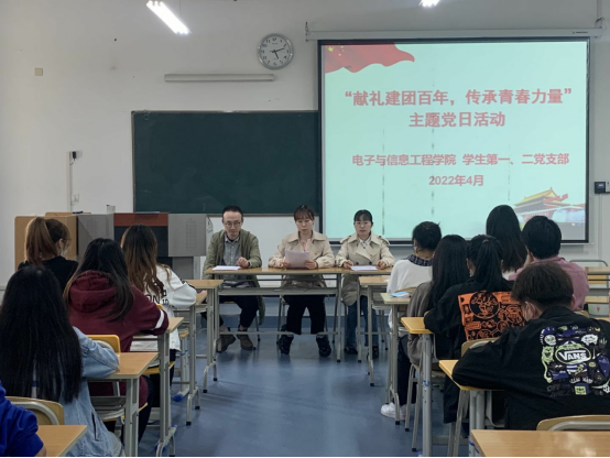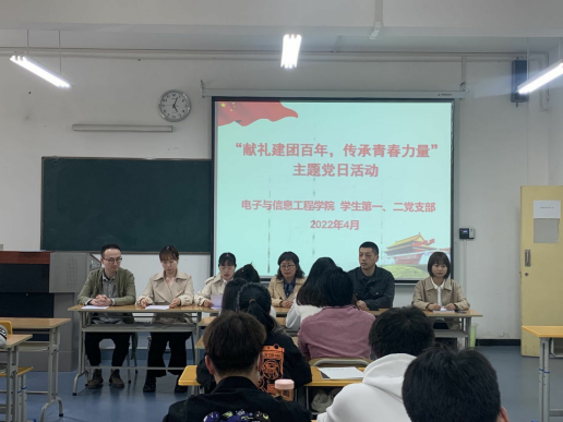为庆祝中国共产主义青年团成立100周年,喜迎中国共产党第二十次全国代表大会即将召开,为落实立德树人根本任务,加强爱国主义教育,引导和激励青年坚定理想信念,以思想价值教育引领学风建设,培养德智体美劳全面发展的社会主义建设者和接班人。4月20日下午,在江北校区1321教室,pa电子官方网站学生第一、二党支部联合开展政治理论学习暨“献礼建团百年,传承青春力量”主题党日活动。党总支组织委员成英丽,学生第一党支部书记程晓梅、组织(纪检)委员张宇航,学生第二党支部书记李章雨、组织(纪检)委员石纭昊,辅导员吕以宁和在校学生党员参加,主题党日活动由学生第一党支部书记程晓梅主持。