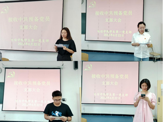 6月22日下午,pa电子官方网站学生第一党支部在1321教室召开了关于接收肖薇等8名同志为中共预备党员的支部大会。pa电子官方网站学生第一党支部书记程晓梅,党总支组织(纪检)委员成英丽,支部组织(纪检)委员张宇航,辅导员吕以宁,支部全体在校学生党员和本期发展对象参加了会议。会议由程晓梅主持。