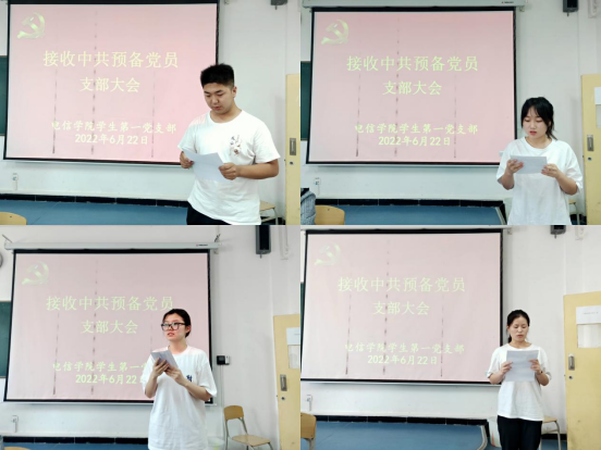 接着,会议严格按照党组织接收中共预备党员的流程进行。2020级物联网工程1班肖薇和杨艺涵,2020级计算机科学与技术1班刘雨晴、李盼洲,2020级应用物理学1班冯雨迪、李文琦,2020级电子商务1班张思凡,2020级计算机科学与技术2班齐涵茹8名发展对象向党组织汇报了自己在校期间的综合表现,总结了自己在思想、工作、生活、学习等方面所取得的成绩,深刻剖析不足之处,表达了自己想要加入中国共产党的坚定决心。随后,发展对象的入党介绍人分别就他们在校期间的教育和考察情况作了汇报发言,并对其能否入党表明意见。