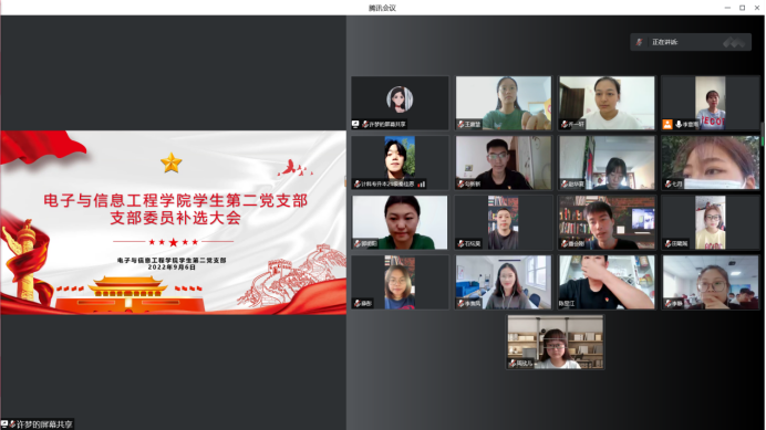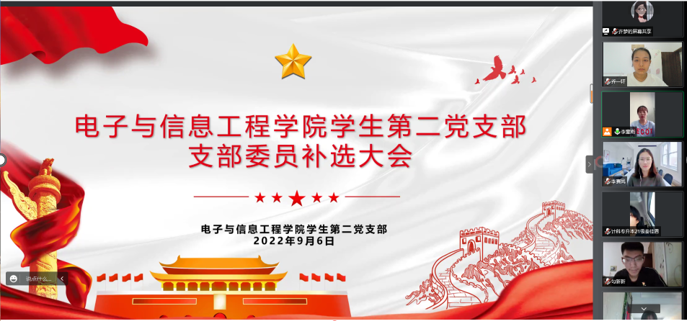 由于学生第二党支部委员会原支部宣传(统战)委员蒋帅已经毕业离校,为确保党支部班子健全、稳定并有序开展工作,根据《中国共产党章程》规定、《中国共产党基层组织选举工作条例》和《中共pa电子官方网站委员会二级党组织换届选举工作方案》要求,2022年9月6日,pa电子官方网站学生第二党支部通过线上腾讯会议召开支部党员大会,顺利完成支部委员会补选工作,补选出了新的支部委员会宣传(统战)委员。会议由学生第二党支部书记李章雨同志主持召开。