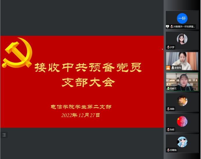 2022年12月27日,pa电子官方网站学生第二党支部通过线上腾讯会议召开党员大会接收中共中央预备党员,讨论接收2020级电子信息工程1班张炬、钱峙艺两位同志加入中国共产党事宜。本次大会由pa电子官方网站学生第二党支部书记李章雨主持,全体党员同志及本期发展对象参与此次议会。