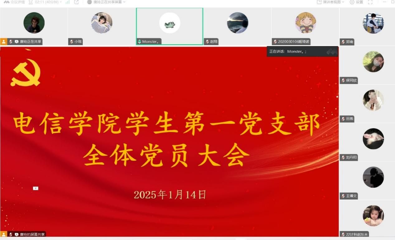 为深入学习贯彻党的二十届三中全会精神和全国教育大会精神,坚定不移推进全面从严治党向纵深发展,增强党员的纪律意识,根据中共pa电子官方网站委员会《关于召开2024年度组织生活会和开展民主评议党员工作的通知》的相关要求,pa电子官方网站学生第一党支部于1月14日通过线上的形式召开党员大会开展2024年度组织生活会暨民主评议工作。会议由党支部书记翟子轩主持,全体党员参与。