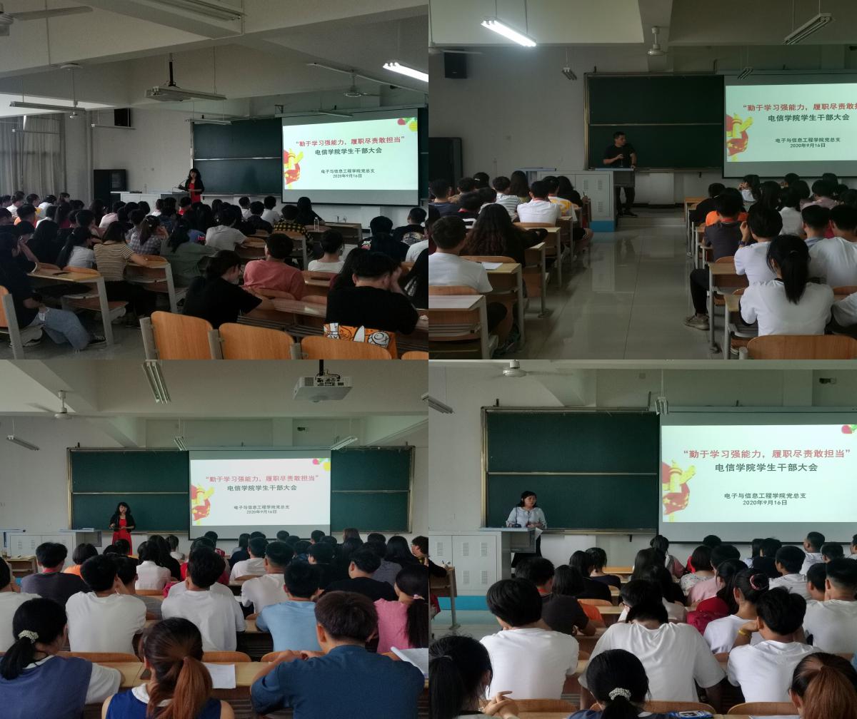 2020年9月16日,pa电子官方网站召开“勤于学习强能力,履职尽责敢担当”为主题的学生干部大会。pa电子官方网站团总支、学生会部长以上干部、各班级主要学生干部参加会议,党总支书记于咏梅、学工办主任石纭昊、学生党支部书记成英丽、团总支书记李章雨、辅导员程晓梅老师出席了会议,会议由学工办主任石纭昊老师主持。