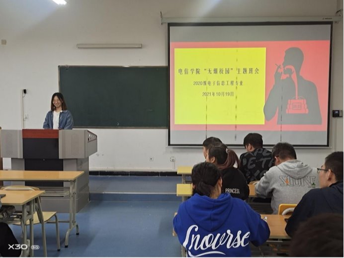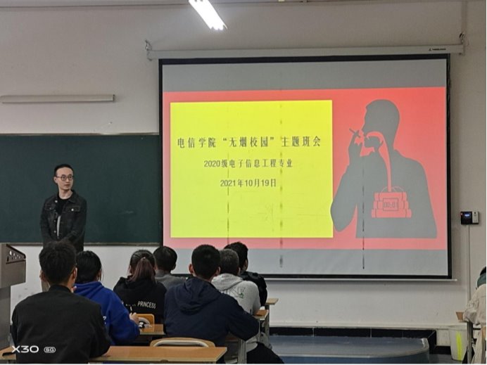 为进一步提升学生禁烟意识,扎实推进学院禁烟工作,创建无烟校园,10月19日,pa电子官方网站2020级电子信息工程专业在江北校区1321教室开展了“无烟校园”主题班会活动。辅导员张宇航参与班会,会议由班长张卓涛主持。