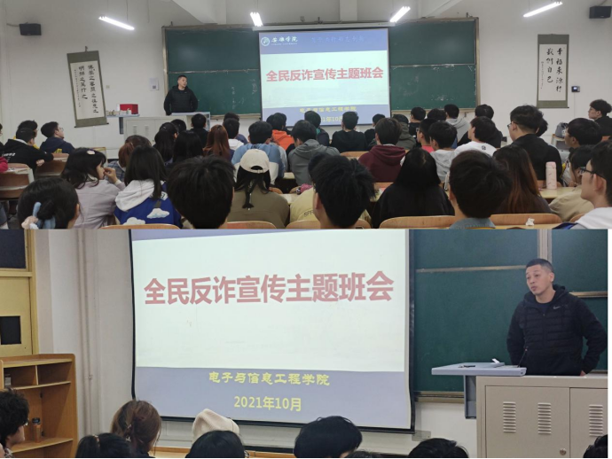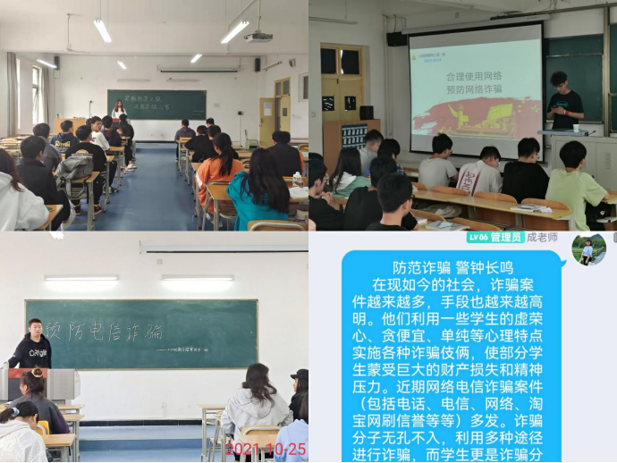 随着通讯科技设备的普及,电信诈骗事件层出不穷,为有效遏制电信网络诈骗犯罪发生,形成坚实的校园防范基石,切实杜绝受害。10月24日,pa电子官方网站组织各班开展“防范电信诈骗、保障财产安全”系列主题班会。学工办主任石纭昊、辅导员成英丽、李章雨、程晓梅、张宇航分别参与所带班级会议,各班会议由本班团支书主持。
