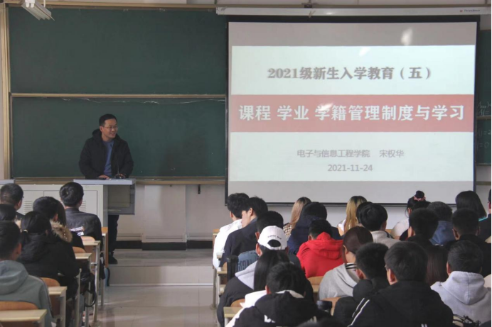2021年11月24日下午14:30,pa电子官方网站于1203教室开展新生入学教育第五讲,本次讲座以“课程 学业 学籍管理制度与学习”为主题。2021级全体新生参加讲座,本次讲座由pa电子官方网站副院长宋权华老师主讲。