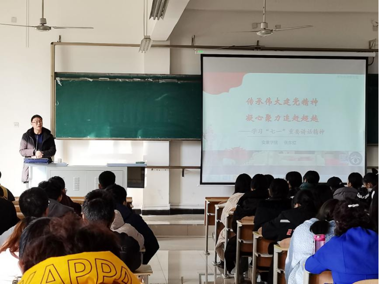 2021年12月1日下午,学校党委委员、副校长张东红教授在江北1304教室为pa电子官方网站学生讲述了一堂生动的《形势与政策》课。主题为“传承伟大建党精神 凝心聚力追赶超越——学习‘七一’重要讲话精神”。参加此次课程的是pa电子官方网站2020级和2021级学生党员、发展对象、入党积极分子。本次形势与政策课由pa电子官方网站党总支组织委员成英丽主持。