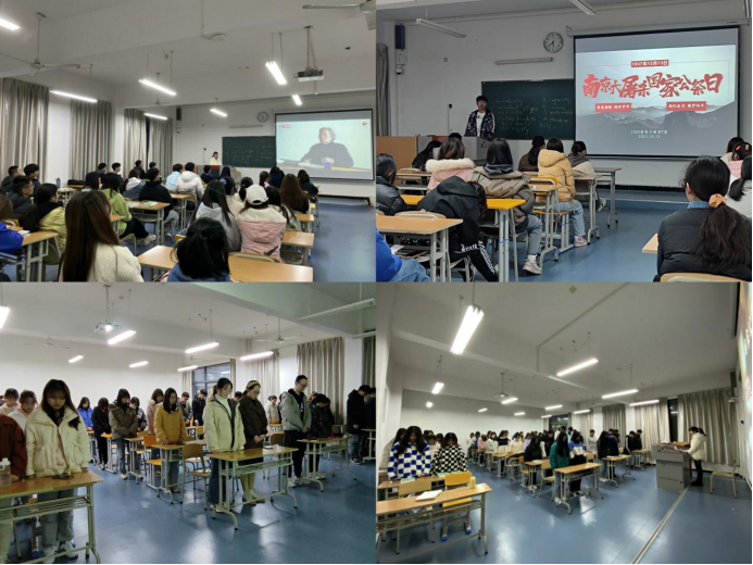这次活动中,各班通过观看纪录片了解那段难以抚平的伤痛历史;通过团支书的动情演说引导大家切实感受南京之痛、华夏之殇;通过集体默哀的形式来缅怀所有先辈英烈以及在战争中遇害的同胞们。整个活动中全场肃穆安静,气氛沉重严肃。会后,同学们纷纷发表感言,“愿世界永远和平,不再有战争和杀戮,愿光明不灭,正义永恒”、“铭记历史,勿忘国耻,吾辈自强,盛世永康”、“饮冰十年,热血不凉。祈同胞安息,愿国家昌盛”。“我们以国家之名祭奠死难者,以尊崇之心珍视和平,以民族之力矢志复兴。我们从来都是坚定不移的唯物主义者,但是却希望你们有来生。”一句句发自肺腑的话语,体现电信学子深深的爱国情感,激励着同学们奋发图强,在铭记历史和缅怀先烈的思考中坚定理想信念,在实现中国梦的生动实践中放飞青春梦想。