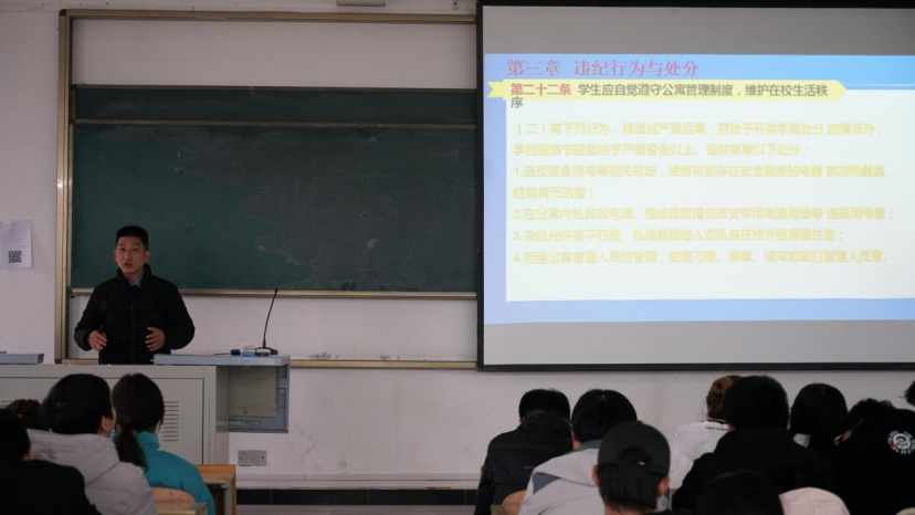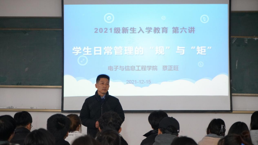 2021年12月15日下午,pa电子官方网站在1204教室开展了新生入学教育第六讲,本次讲座主题----学生日常管理中的“规”与“矩”。2021级全体新生参加讲座,本次讲座由pa电子官方网站党总支副书记蔡正旺老师主讲。