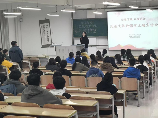 古以文载道,今以文聚力。为积极传播与弘扬中华优秀传统文化,加强非物质文化遗产知识普及,弘扬中华民族精神、传播民族团结主旋律,进一步凸显中华优秀传统文化铸魂育人功能,11月13日,pa电子官方网站开展以“培根育魂 石榴花开”为主题的民族文化进课堂宣讲活动。本次活动由pa电子官方网站腰鼓社负责人段银主讲。