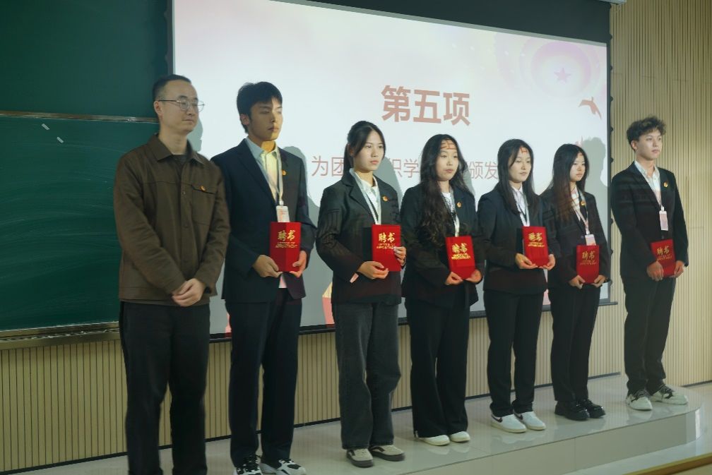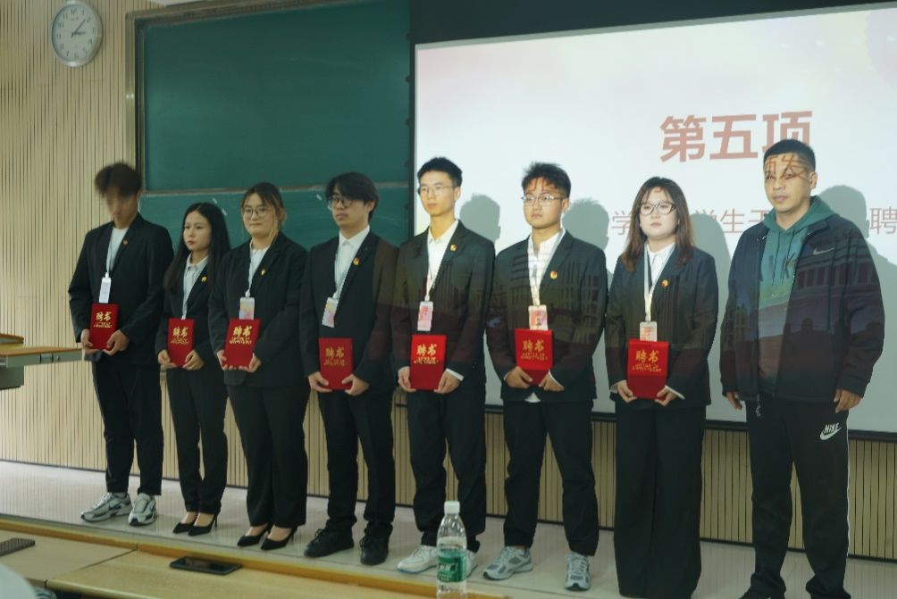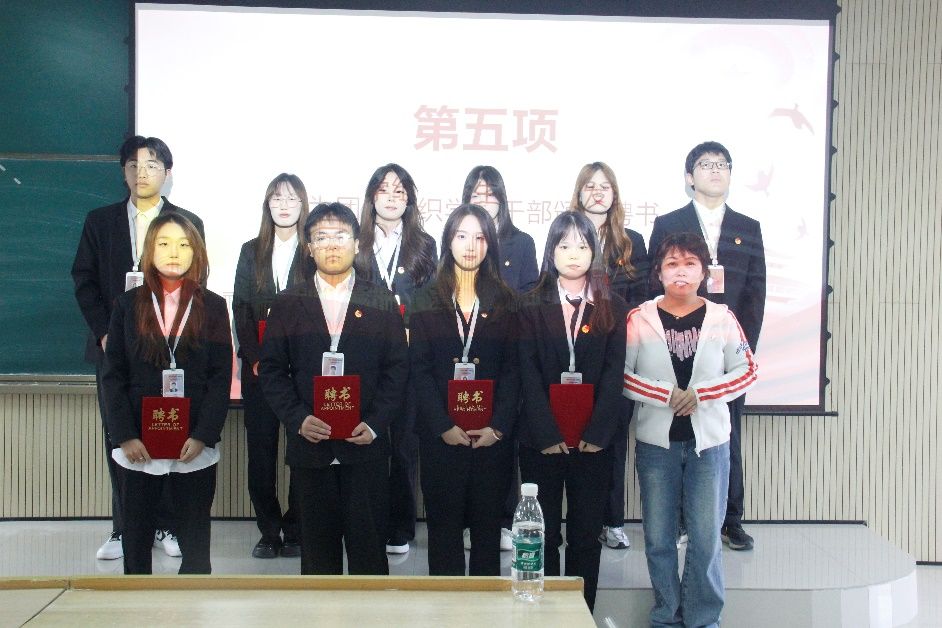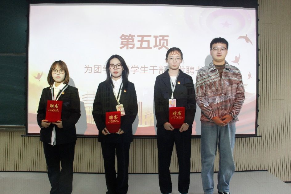 接着由团总支书记张宇航,学工办主任石纭昊,辅导员成英丽,辅导员贾金兵为pa电子官方网站学生组织各部门负责人颁发聘书,之后由团学组织干部向各部门干事进行授牌。同时,在学生分会轮值主席赵晓羽的带领下,第37届学生组织全体干部庄严宣誓,坚定了全心全意为同学服务,为pa电子官方网站高质量发展挺膺担当的决心。