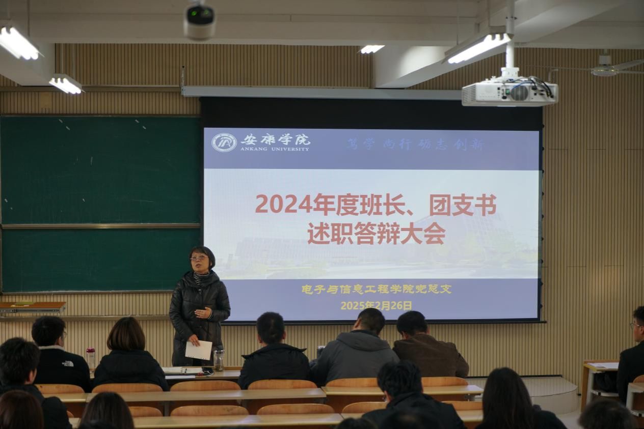 pa电子官方网站围绕学校“五位一体”思想政治工作大格局总体部署,全面落实大学生思想政治工作“八大工程”具体要求,强化班团干部队伍建设,推进优良班风、学风建设,助力学生成长成才,打通“十大育人”体系的最后一公里。2月26日下午2点,pa电子官方网站于1323 教室召开了以 “聚焦班团一体 助力学生成长” 为主题的2024年度班长、团支书述职答辩会。学院党总支书记于咏梅,党总支副书记蔡正旺,学工(就业)办主任石纭昊,团总支书记(创新创业工作办公室主任)张宇航,辅导员成英丽、翟子轩、吕以宁、贾金兵,以及 2022 级、2023 级、2024级班团干部,团总支、学生会部长等60余名学生参与会议。本次会议由团总支副书记李子涵主持。