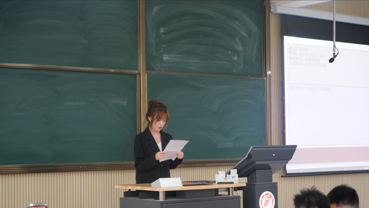 换届选举环节中,参与团总支、学生会、社团服务中心干部竞选的同学依次上台进行5分钟竞选演讲。他们分享在团学组织中的工作收获,结合自身经历阐述对岗位的理解,分享在活动策划、团队协作中的成长感悟,并围绕活动创新、部门协作等方面提出未来工作构想,表达了以热情与担当服务团学组织发展的决心。