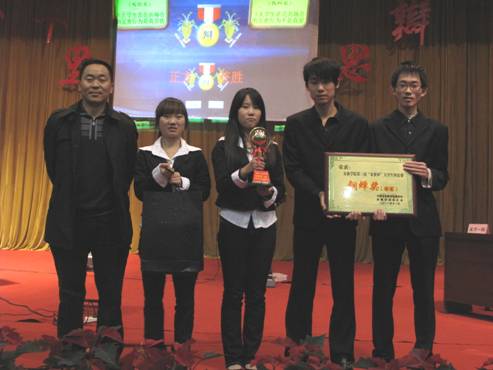 由2010级电子信息工程李郭君、2010级数字媒体技术余倩、2011级计算机科学与技术高枫杰、2011级电子信息工程薛晓奕、2011级数字媒体技术田晓龙五名学生组成“炽天之翼”队代表电信系参加学院“金雀杯”大赛。经过初赛,复赛,决赛等一个多月的角逐,最终获得季军“铜蝉奖”,石纭昊获得优秀指导教师。