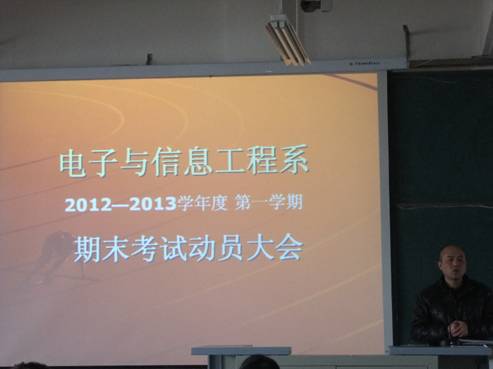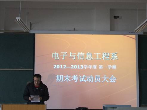 2013年1月17日下午,电子与信息工程系在1号楼301教室举行了考前动员大会,系党总支书记李红兵、系副主任陈守满、学办副主任石纭昊,2012级新生参加会议。会议由系党总支书记李红兵主持。