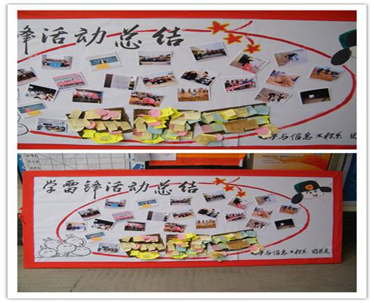 利用学雷锋活动月对全系同学开展“践行雷锋精神 塑造美丽心灵”的教育活动,利用板报进行宣传,通过板报,号召全体学生积极参加学雷锋实践活动,弘扬“团结、友爱、互助、奉献”的雷锋精神。