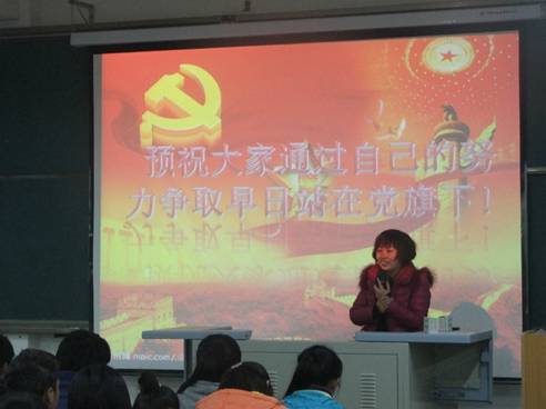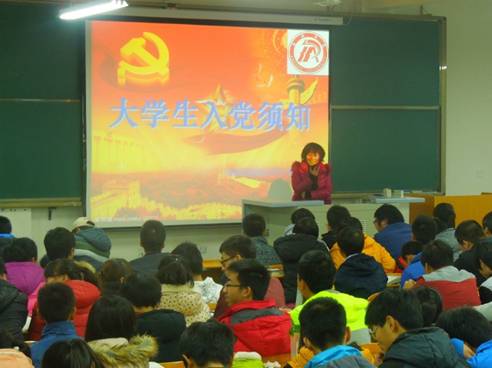 2013年12月11日晚,电子与信息工程系在江北校区1304教室开展了新生入党教育的活动。本次活动由系党总支学生支部书记成英丽老师主持,全体大一新生参加。