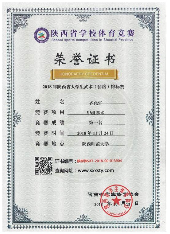 我院2015级电子信息工程专业学生齐兆轩在2018年陕西省大学生武术(套路)锦标赛中获得两金一银的好成绩。