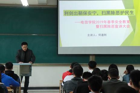 2019年3月22日下午4点,pa电子官方网站团总支于1305教室开展了2019年春季安全教育暨扫黑除恶宣讲活动。参加此次活动的有pa电子官方网站党总支书记何道利、团总支书记陈浩以及pa电子官方网站全体学生干部。