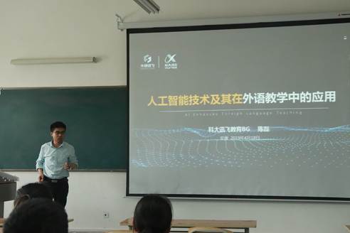 科大讯飞教育陈磊为同学们讲解了目前人工智能技术研究领域的相关知识,介绍了科大讯飞公司在人工智能技术的研究方向以及他们把这项技术运用到教育和日常生活中的实例。并现场演示了由科大讯飞研发的人工智能技术在外语教学软件fif中口语训中的使用方法。