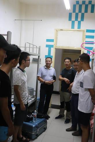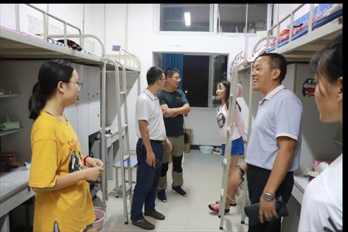 2018年9月1日晚上八点,电信学院党总支书记何道利,副院长王庆春、王克刚,学工办主任石纭昊,辅导员陈浩到7号公寓和9号公寓看望大一新生。 何书记一行人逐个走访新生宿舍,和新生及家长亲切交谈,希望新生们能够忍耐炎热酷暑,做好准备迎接军训,同时嘱咐新生注意人身、财务安全,谨防诈骗等事项。