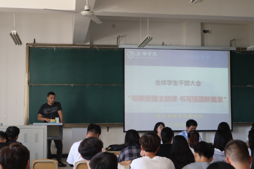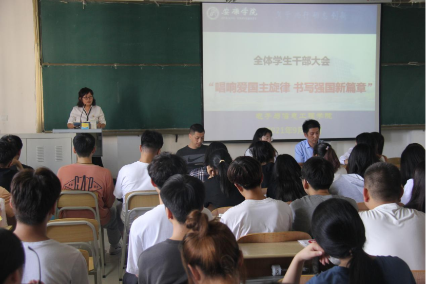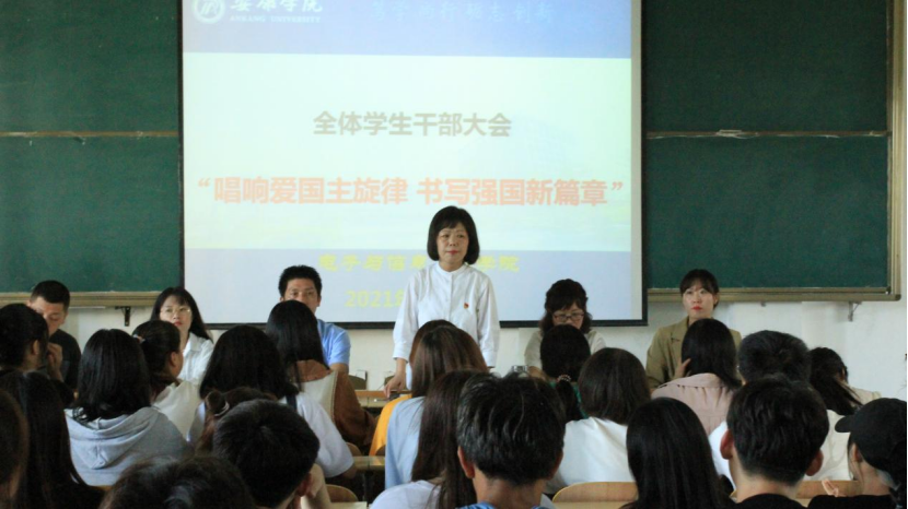 为庆祝中华人民共和国成立72周年,引导广大青年学生自觉践行社会主义核心价值观,涵养家国情怀,增强感恩意识,以实际行动向国庆献礼。9月29日下午2:30,在江北校区1301教室pa电子官方网站党总支书记于咏梅以“唱响爱国主义旋律,书写强国新篇章”为主题为广大电信学子讲党课、团课。pa电子官方网站在校学生党员、本届团总支、学生会主要干部及2019、2020、2021级主要干部、宿舍长200余人参加大会。党总支书记于咏梅,党总支副书记蔡正旺,学工办主任石纭昊,党总支组织委员成英丽,学生第一党支部书记程晓梅,学生第二党支部书记李章雨出席大会。大会由石纭昊主持。
