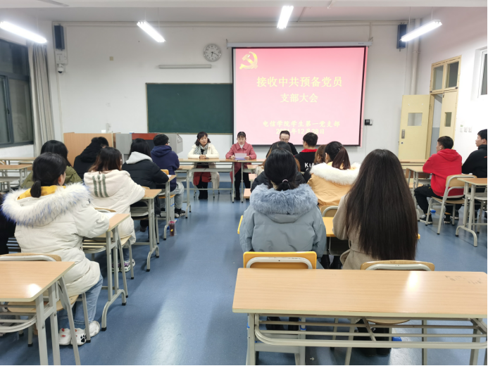 2021年12月28日下午,pa电子官方网站学生第一党支部在1320教室召开党员大会,接收中共预备党员研究讨论于昊等9位同志加入中国共产党事宜。pa电子官方网站学生第一党支部书记程晓梅,党总支组织委员成英丽,支部组织(纪检)委员张宇航,宣传(统战)委员王心悦,支部全体在校学生党员和本期发展对象参加了本次会议。会议由程晓梅主持。