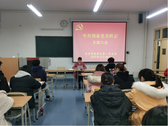 2021年12月28日下午,pa电子官方网站学生第一党支部在1320教室召开了中共预备党员转正党员大会,会议主要讨论了杨宁、韩小娟、杨吴龙、邢敏婷、韩浩鸿、刘欢、郝刚7名中共预备党员的转正事宜。pa电子官方网站学生第一党支部书记程晓梅,党总支组织委员成英丽,支部组织(纪检)委员张宇航,宣传(统战)委员王心悦,支部全体在校学生党员参加了本次会议。会议由程晓梅主持。