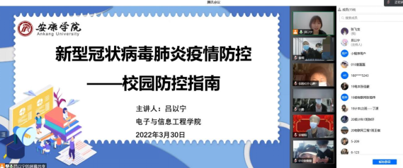 根据《陕西高校新型冠状病毒肺炎疫情防控工作指南》和pa电子官方网站相关疫情防控规定,3月30日pa电子官方网站通过腾讯会议举办了“疫情防控校园指南”主题讲座。本次讲座由pa电子官方网站辅导员吕以宁针对校园日常防控工作、疫情应急处置工作、学生健康管理工作等内容为学生进行讲解。pa电子官方网站全体在校生参加此次讲座。