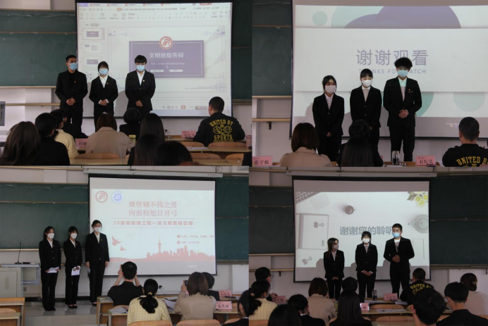 本次共有22个班级参与答辩,各班由班长、团支书及任意一名班委成员组成的三人答辩团,重点围绕组织建设、思想教育、班级特色工作、学风建设、志愿服务、社会实践与疫情防控等方面对班级及团支部工作开展情况进行介绍。同时,借助PPT讲解、视频影像及纸质版工作总结材料等,在增强班集体凝聚力、战斗力和创造力,营造良好的班级文化、学习氛围以及打造班级鲜明特色等方面多角度地对创建文明班集体进行了汇报,充分展示了班集体与班级成员在过去的一年里取得的荣誉与成就。面对各评委提问,各班级答辩人以清晰的思路,细致地回答,展现出电信学子积极向上的精神面貌。同时,评委们就具体情况对各答辩班级提出针对性建议,对各答辩班级进行指导。答辩班级认真听取建议,为今后班级建设积累重要经验。
