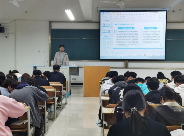 讲座伊始,办公室潘昊泽讲述了防范网络诈骗时从防范网络诈骗小常识、防范诈骗小常识及“网络钓鱼”诈骗七种手法等方面,对学生谨防网络诈骗奠定了基础。