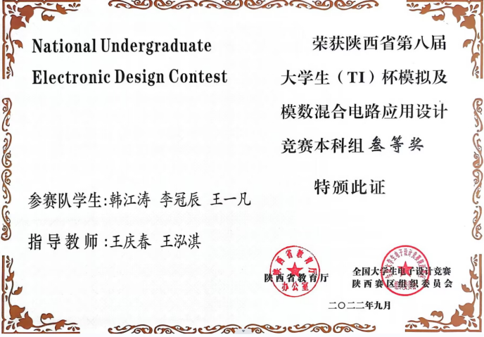 陕西省第八届大学生(TI)杯模拟及模数混合电路应用设计竞赛获奖证书