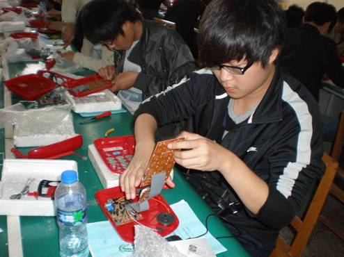 仪式结束后,李红兵书记参观了学生制作电话机的实习现场,对学生认真的学习态度,对电话机的控制板良好的焊接技术表示满意。