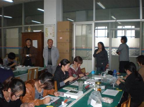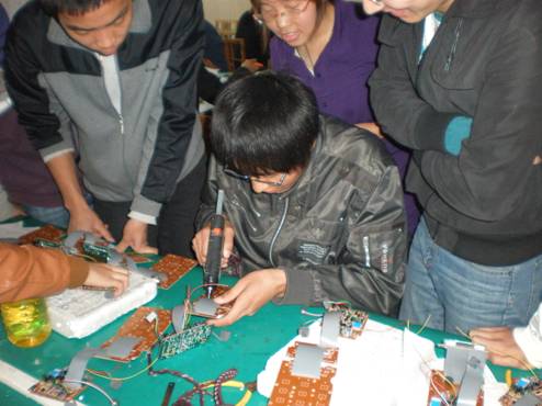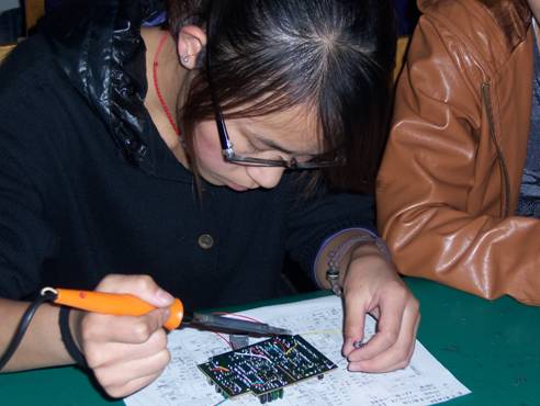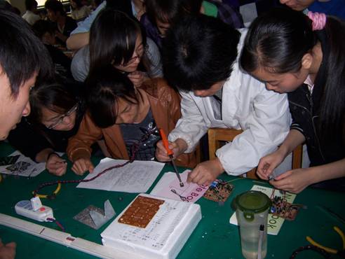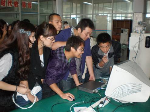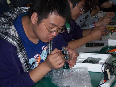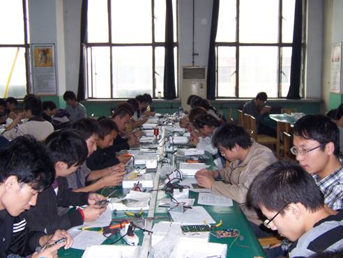 仪式结束后,李红兵书记参观了学生制作电话机的实习现场,对学生认真的学习态度,对电话机的控制板良好的焊接技术表示满意。