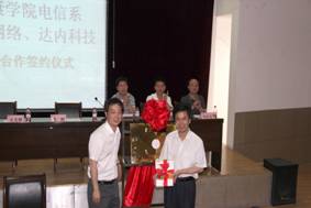6月21下午,在1号教学楼6楼报告厅隆重举行电信系与锐捷网络、达内科技校企合作签字仪式。学校副校长陈刚教授、锐捷网络西北大区市场总监史光耀、达内科技陕西中心主任陈相峰、教务处处长钟生海、电信系主任张东红、党总支书记李红兵和电信系全体教师,计算机、电子信息工程专业200多名学生参加了签字仪式。大会由张东红教授主持。