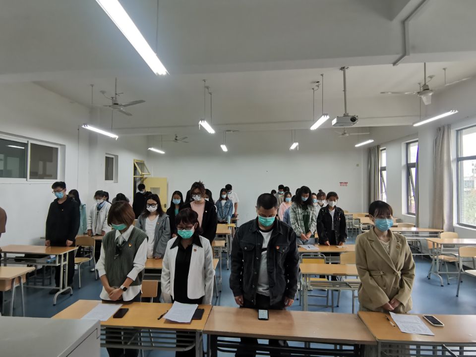 会议伊始,全体与会师生奏唱《中华人民共和国国歌》,为英雄烈士默哀一分钟。