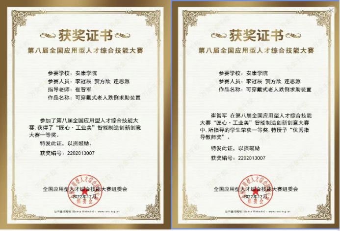 本届大赛设置“匠心•民族魂”平面设计大赛、“匠心•工业美”智能制造创新创意大赛、“匠心•职场秀”简历精英挑战大赛、“匠心•青春梦”大学生职场装创意设计大赛、及教师组的“匠心•园丁情”教师创课大赛、“匠心•园丁情”辅导员职业能力大赛共6个参赛科目,共有来自全国896所院校、12578支队伍报名参赛。竞赛采用参赛队线上答辩、专家线上混合评审的方式进行,参加评审的评委均为来自行业著名企业和高校相关领域的专家。参赛项目历经答辩、实物演示以及专家质询三个环节,我院两组参赛团队最终荣获“匠心•工业美”智能制造创新创意大赛一等奖和二等奖,指导老师崔智军和王泓淇分别被授予“优秀指导教师奖”。