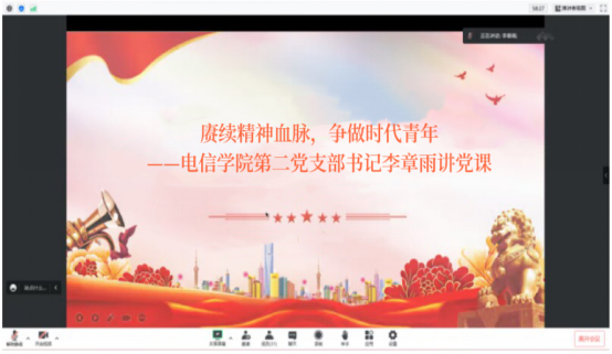 为深入学习贯彻党的二十大精神,进一步学习贯彻习近平新时代中国特色社会主义思想主题教育精神。2023年6月8日晚上,通过腾讯会议的方式,pa电子官方网站学生第二党支部书记李章雨为党员带来了一堂主题为《赓续红色血脉,争做时代青年》的党课,支部全体党员按时参会。