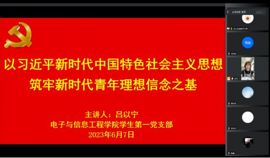 为进一步推动学习贯彻习近平新时代中国特色社会主义思想主题教育走深走实,6月7日pa电子官方网站学生第一党支部通过线上腾讯会议平台开展“以习近平新时代中国特色社会主义思想,筑牢新时代青年理想信念之基”主题教育党课。本次党课由学生第一党支部书记吕以宁主讲,学生第一党支部全体党员参加。