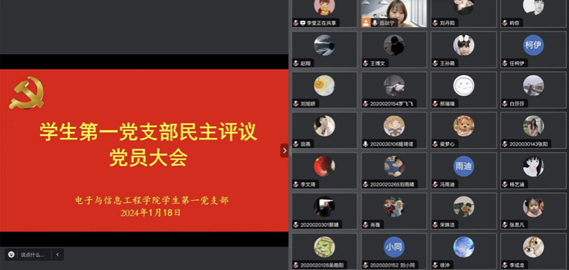 根据中共pa电子官方网站委员会《关于开展2023年度民主评议党员工作的通知》要求,2024年1月18日晚上7点,pa电子官方网站学生第一党支部通过腾讯会议召开2023年度民主评议党员大会。学生第一党支部全体党员参加,会议由学生第一党支部书记吕以宁主持。