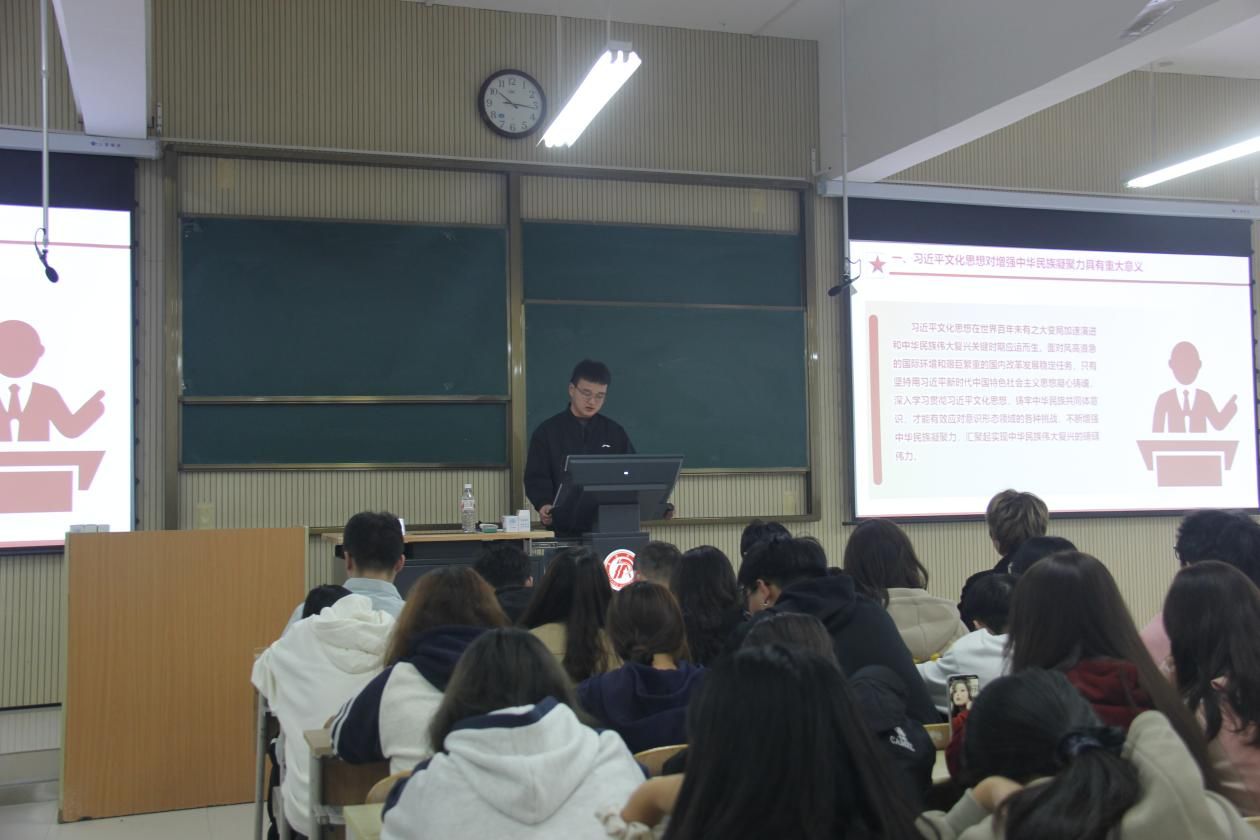 贾金兵向同学们阐述了习近平文化思想对增强中华民族凝聚力具有重大意义,他强调,铸牢中华民族共同体意识不仅是国家发展战略的关键所在,更是民族复兴征程中的重要精神指引,同学们深刻认识到中华民族共同体意识对于国家稳定、民族和谐发展的深远影响。