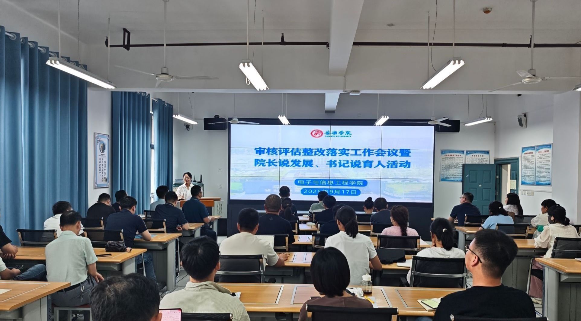 9月17日下午,pa电子官方网站召开审核评估整改落实工作会,安排部署审核评估整改落实工作督导检查任务,并开展院长说发展、书记说育人活动。学院全体教职工参加活动,活动由学院院长王克刚主持。