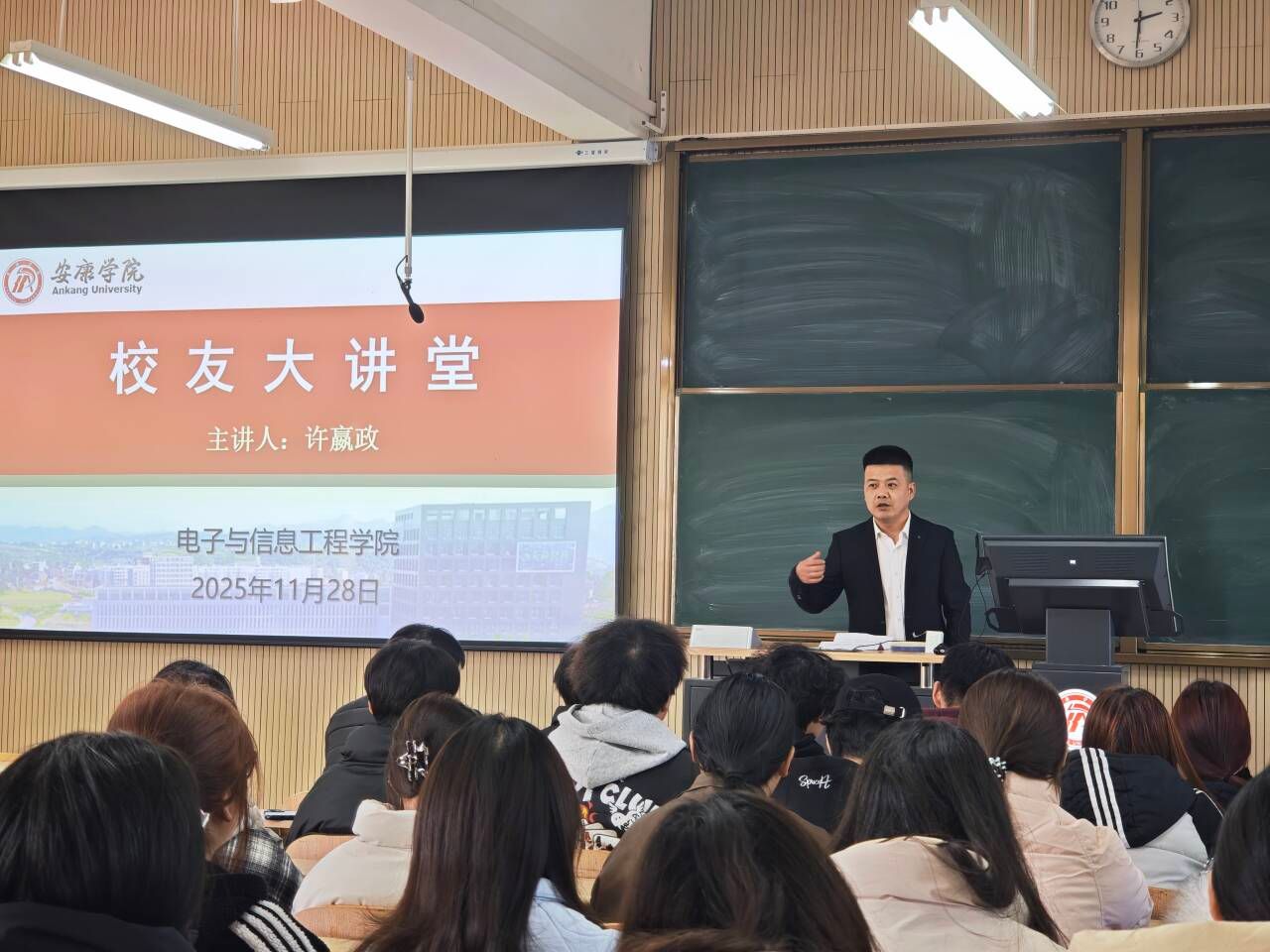 2025年11月28日下午,pa电子官方网站在1304教室成功举办了“校友大讲堂”活动。本次活动特别邀请了学院优秀校友、2013届电子信息技术毕业生许嬴政担任主讲嘉宾,他以自身成长与创业经历为蓝本,为在校学子带来了一场兼具深度与温度的精彩分享,为母校人才培养与家乡高质量发展注入新动能。
